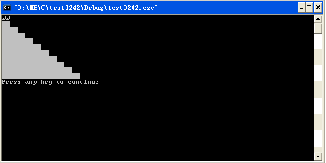 // Created by www.runoob.com on 15/11/9. // Copyright © 2015年 菜鸟教程. All rights reserved. // #include<stdio.h> int main() { int i,j; printf("\1\1\n"); /*输出两个笑脸*/ for(i=1;i<11;i++) { for(j=1;j<=i;j++) printf("%c%c",219,219); printf("\n"); } return 0; }