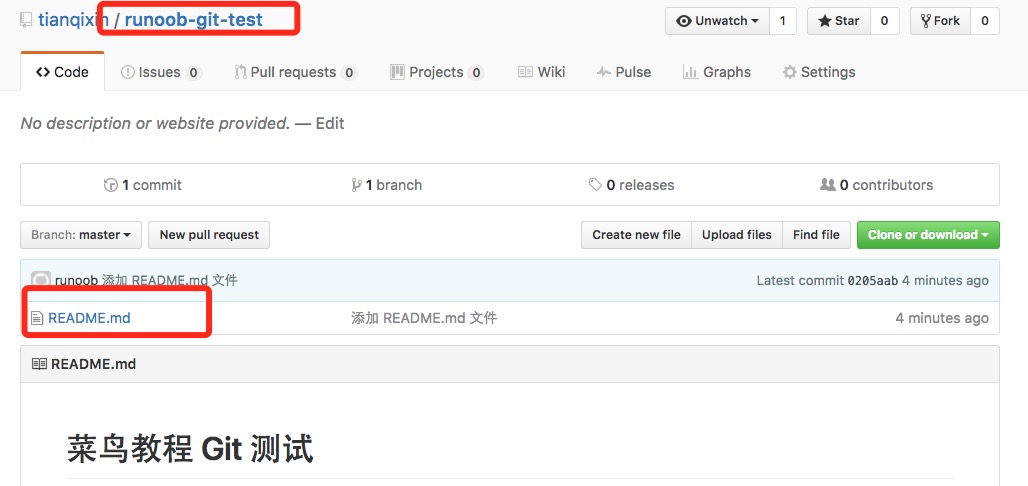 $ mkdir runoob-git-test # 创建测试目录 $ cd runoob-git-test/ # 进入测试目录 $ echo "# 菜鸟教程 Git 测试" >> README.md # 创建 README.md 文件并写入内容 $ ls # 查看目录下的文件 README $ git init # 初始化 $ git add README.md # 添加文件 $ git commit -m "添加 README.md 文件" # 提交并备注信息 [master (root-commit) 0205aab] 添加 README.md 文件 1 file changed, 1 insertion(+) create mode 100644 README.md # 提交到 Github $ git remote add origin git@github.com:tianqixin/runoob-git-test.git $ git push -u origin master