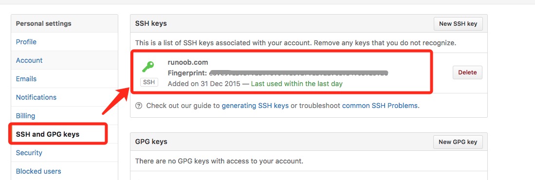 左边选择 SSH and GPG keys,然后点击 New SSH key 按钮,title 设置标题,可以随便填,粘贴在你电脑上生成的 key。