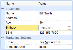 {"name":"Name","value":"Bill Smith","group":"ID Settings","editor":"text"},