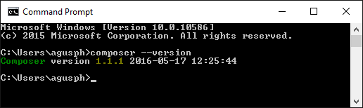 $ curl -sS https://getcomposer.org/installer | php $ sudo mv composer.phar /usr/local/bin/composer $ composer --version Composer version 1.7.2 2018-08-16 16:57:12